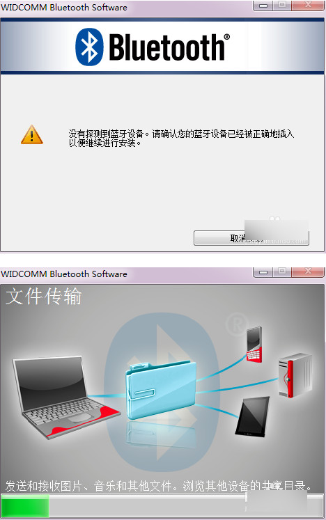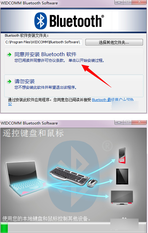 点击同意安装,程序开始运行,稍等一会,系统会提示没有检测到蓝牙设备,这个时候插入蓝牙适配器(一定要等到提示的时候再插入),系统自动识别,继续运行安装,直到完成。