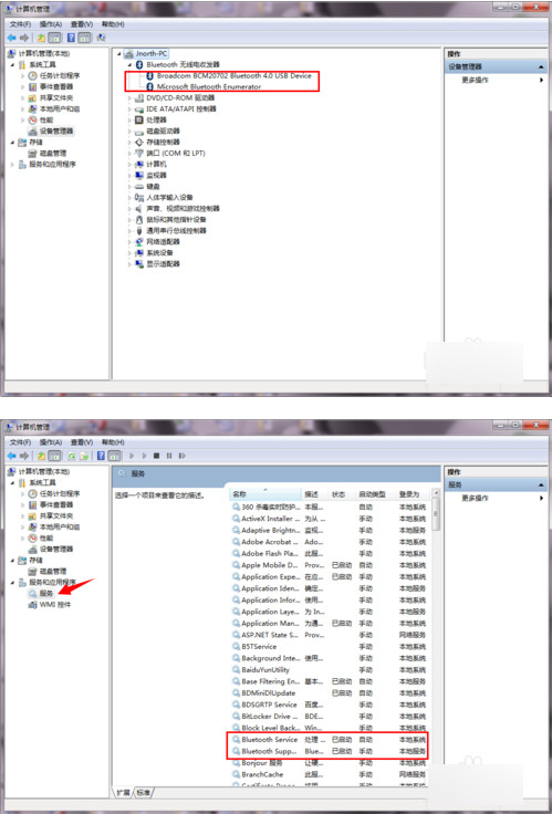 安装后在桌面计算机图标上面右键点击管理,查看设备管理器里检查这个设备是不是正常的,一般安装后有两项,如下图示;其次在服务和应用程序中双击服务打开,查看两项服务一定要启动。如上两项全部检测完毕,就可以开始体验蓝牙服务了。
