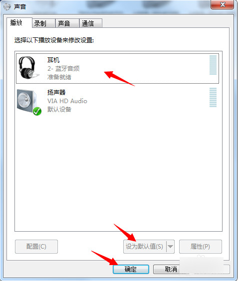 如果连接好后没有声音,可以在右下角的声音图标上面右键点击播放设备,选中蓝牙音频的耳机,设为默认值,这样就可以使用蓝牙耳机了。
