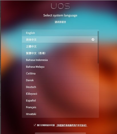 1.安装UOS的硬盘要求至少需要64G,若果是在虚拟机中的安装体验,需要划分64G的虚拟硬盘空间,系统安装建议的空间大小为128G。你可以根据实际的情况进行划分。完成相关的设置后,将uos安装文件挂接后开机进行安装,安装的第一步选择需要安装系统的语言。这里选择【简体中文】并勾选同意协议。点击【下一步】继续安装。