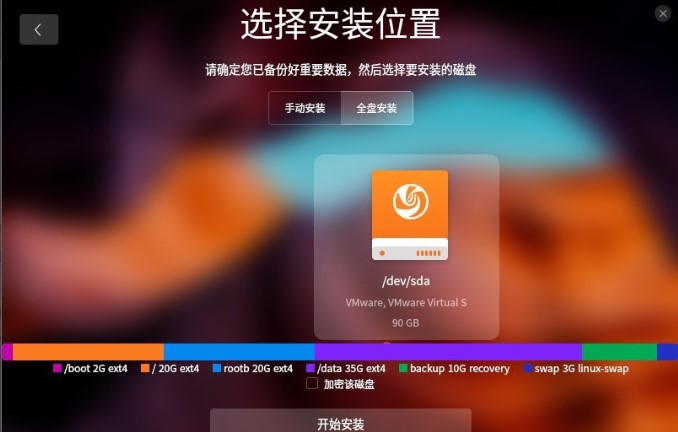 3.选择安装的位置,这里挂接的是全新虚拟机硬盘,选择全盘安装,并选择对应的磁盘。从下面的图片中可以看到系统自动划分几个分区,估计是这个原因需要64G以上的硬盘空间。