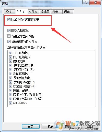 3、然后再点击“7-Zip”选项,勾选“添加7-Zip到右键菜单”,这样当我们右击菜单后就可以使用7-Zip工具了。