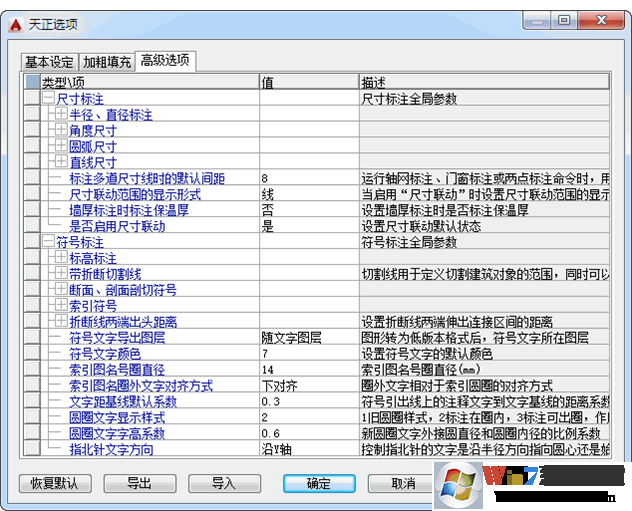 通过【自定义】和【天正选项】可以进行软件界面形式及操作命令方面、建筑设计参数方面的定制设置。此设置可以导出成XML文件,供贵单位其他用户导入,实现参数配置的共享,也可通过“恢复默认”恢复程序最初设置值。