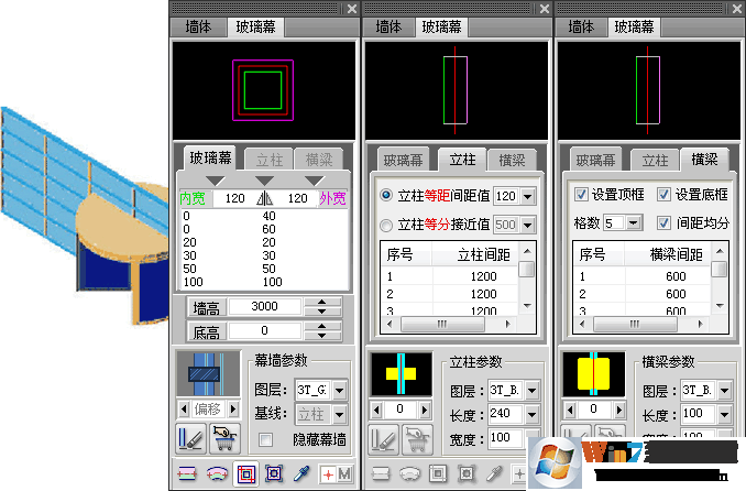 玻璃幕墙:二维采用门窗线简化表达,而三维为精确表达,力求使玻璃幕墙的施工图表达和三维模型表现达到协调一致。