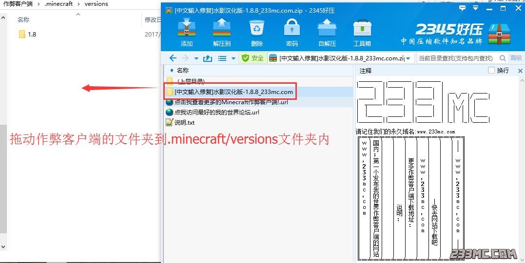 5.将下载好的中文输入修复 LiquidBounce-b2汉化版打开(不用解压) 拖动[中文输入修复]水影汉化版-1.8.8_233mc.com文件夹至.minecraft文件夹内的versions文件夹内