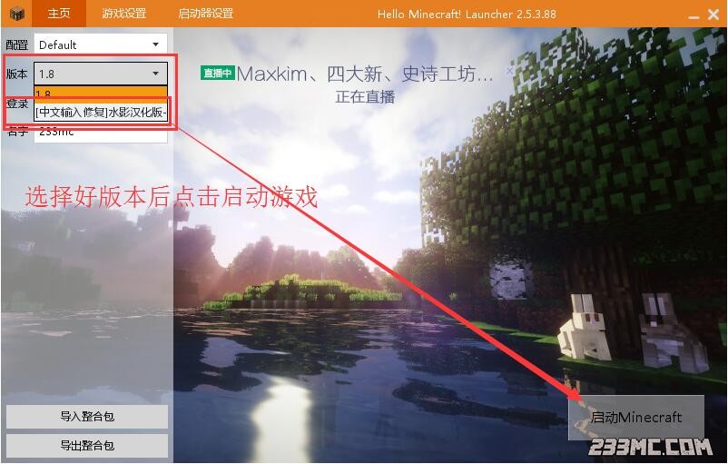 6.再次启动HMCL启动器 在左边的版本选择[中文输入修复]水影汉化版-1.8.8_233mc.com后点击启动Minecraft