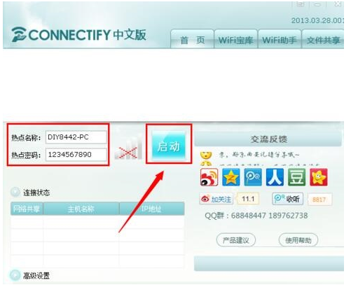 2、然后您可以自行设置ConnectifyWiFi的名称和密码,设置完成后点击【启动】。
