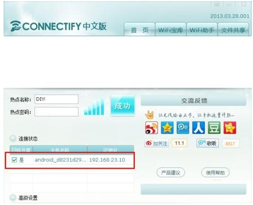 6、当手机等设置连接完成后,在connectify连接状态界面中可以看到已连接的设备信息。