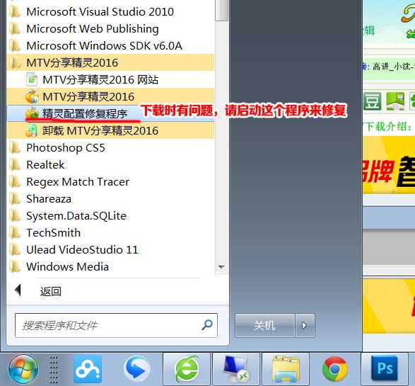 在开始菜单程序MTV分享精灵 文件夹中,有“精灵配置修复程序”,请启动它。