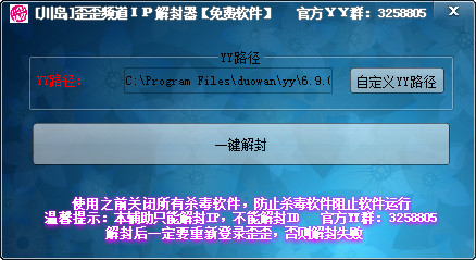 本软件只能解封IP,不能解封ID。解封后一定要重新登录yy,否则解封失败!