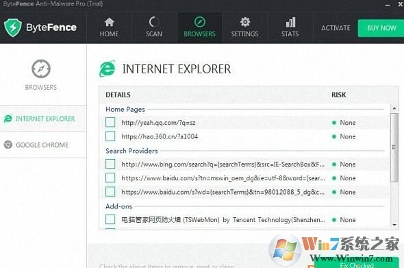 三、除了对系统扫描之外,我们还可以在这款软件中对自己的浏览器进行扫描,进入到这个选项卡之后在左侧可以选择扫描的浏览器名称,点击之后系统会自动扫描,大家只要点击下方的修复按钮进行修复即可二、也可以手动切换到“scan”的选项卡中,可以在三种扫描方式中随意的选择一种进行扫描