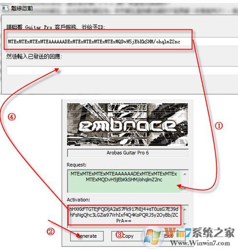 4、运行“注册机”文件夹中的keygen.exe文件(即注册机),将申请码复制粘贴到注册机的“Request”下的输入框中,然后按下“Generate”,生成激活码,最后按下“Copy”复制激活码,到申请码下的输入框中完成激活,如下图所示: