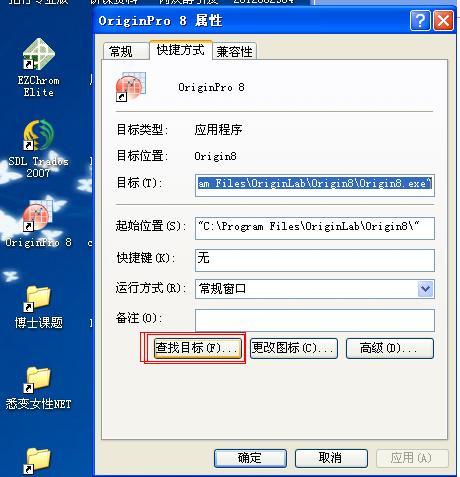 4. 在“桌面”或“程序”中找到Origin8.0的图标,鼠标右键点击“属性”,会弹出下图。点击下图中的“查找目标(F)”按钮,则会进入Origin8的安装目录。