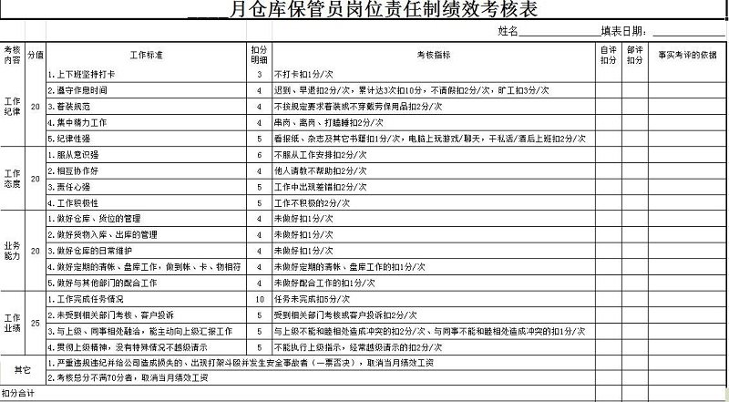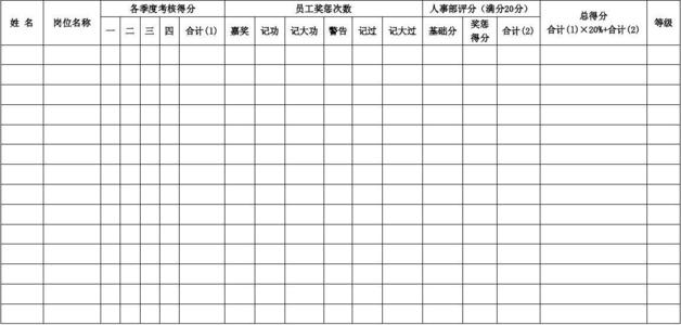 4.计算业绩。其中应填写本季度奖惩情况,其中可包包括受上级部门表彰奖励的加2分。因违反纪律被上司有关部门处分的减分10分工作中发生重大错误的减分5分。迟到、早退、不按规定打卡(因为公务不能正常打卡,所以必须出示领导签字的公差)一次扣0.5分。休假一天减去0.5分,一个月内累计休假三天以上一天减去1分的年薪、探亲假、病假、产假、结婚假等按照国家有关规定执行的缺勤者一天减去2分,一个月内累计缺勤者三天以上一天减去3分。等待类似的情况。