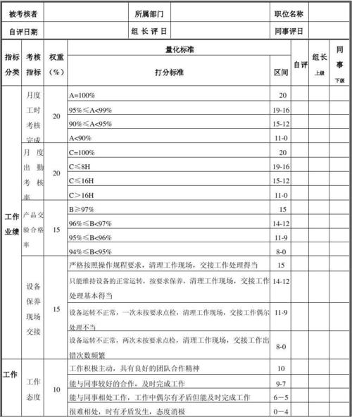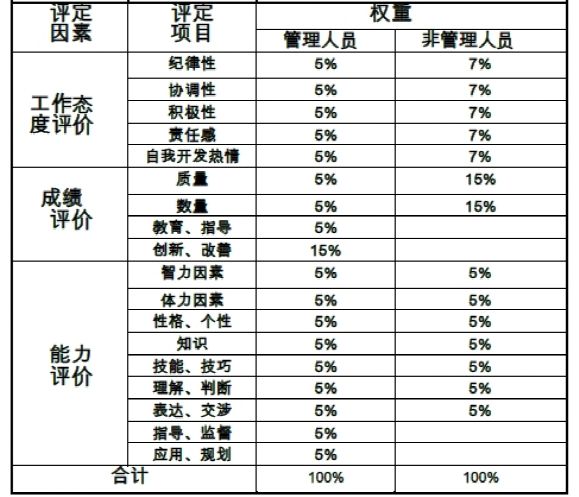 1.素质绩效:通过员工日常工作表现和行为,考察其工作责任感和工作态度;