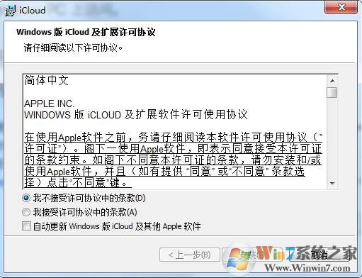 1、双 击运行下载的iCloudSetup.exe,同意许可协议条款;