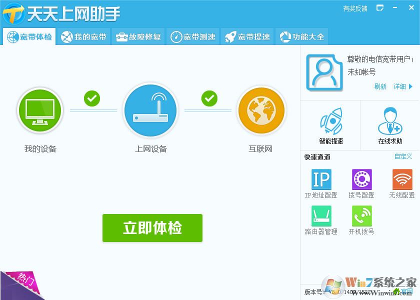 天天上网助手是中国电信推出的一款宽带网络辅助工具,可以为您提供电脑上网故障修复、宽带体检、宽带测速和宽带提速等功能,更有很多实用的网络功能,让你安全、高速的享受冲浪的乐趣!