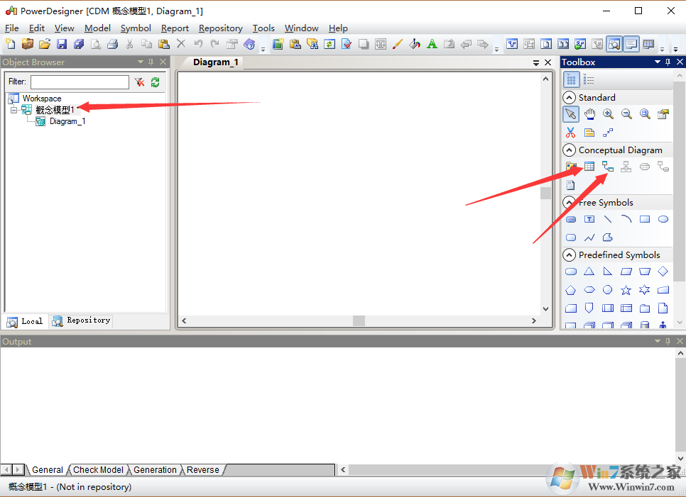 3:点击上面的ok,即可出现下图左边的概念模型1,自己起得概念模型的名字,使用最多的就是如图所示的那两个Entity(实体),Relationship(关系)
