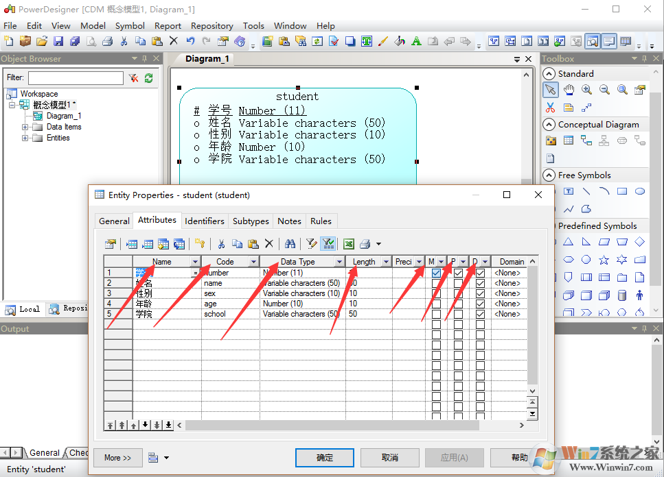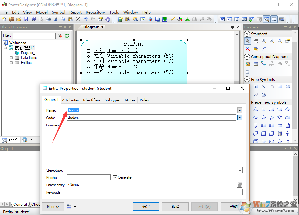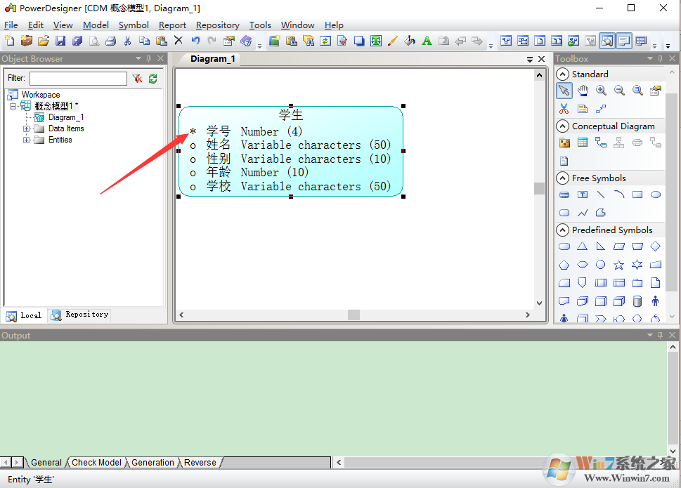 7:创建好概念数据模型如图所示,但是创建好的字体很小,读者可以按着ctrl键同时滑动鼠标的可滑动按钮即可放大缩写字体,同时也可以看到主标识符有一个*号的标志,同时也显示出来了,name,Data type和length这些可见的属性
