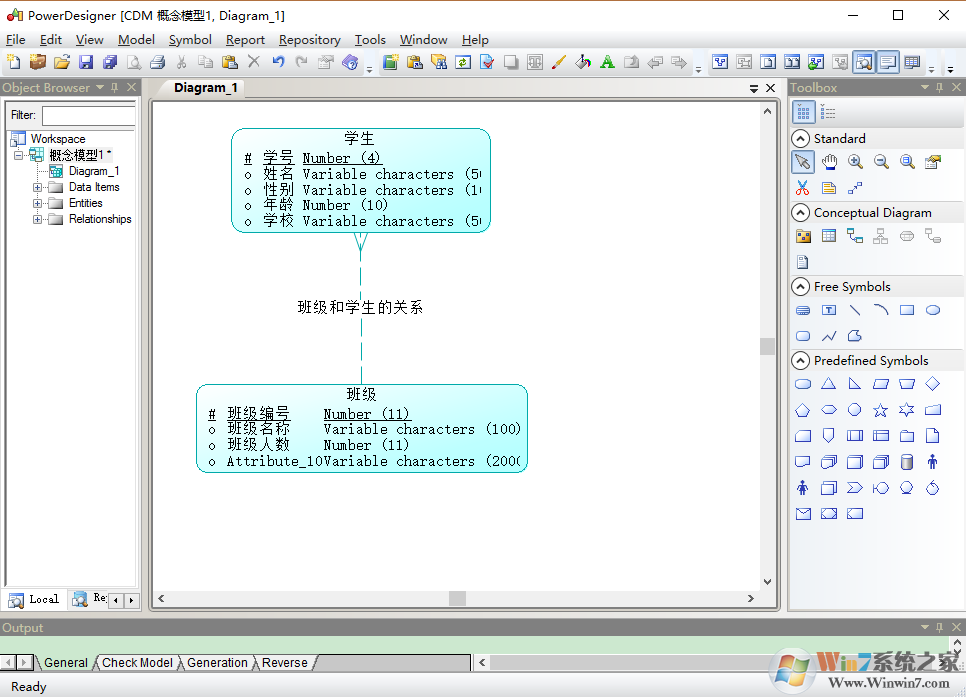 (需要注意的是点击Relationship这个按钮,就把班级和学生联系起来了,就是一条线,然后双击这条线进行编辑,在General这块起name和code)