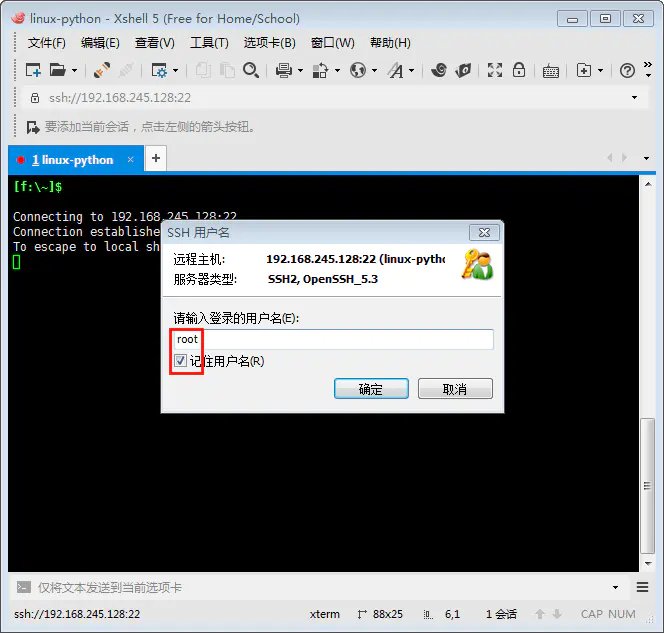 4.输入SSH用户名,勾选记住用户名,确定。