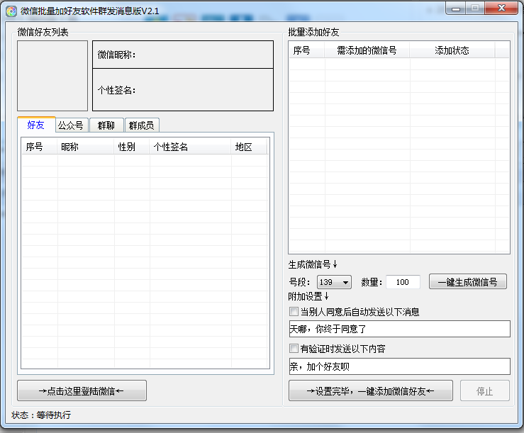 使用简要:登录微信,生成手机类型的微信号,即可开始一键添加微信好友。