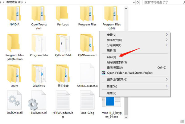 2、打开电脑【C盘】,在空白处鼠标右击选择【粘贴】。