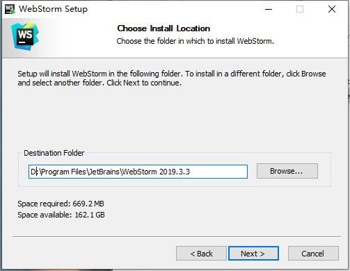 5、点击【Browse】更改软件的安装目录,建议安装在除C盘之外的其它磁盘,可以在D盘或其它盘新建一个【WebStorm 2019.3.3】文件夹,然后点击【Next】。