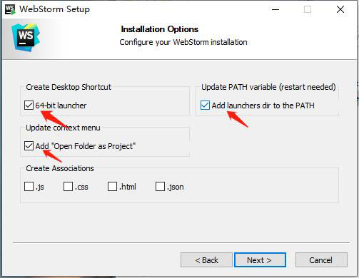 6、勾选【64-bit launcher】、【Add launchers dir to the PATH】和【Add "Open Folder as Project"】然后点击【Next】。