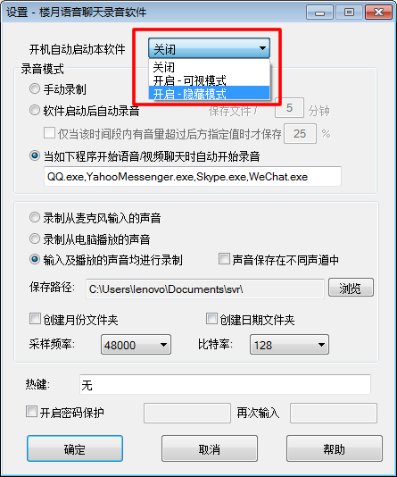4. 如果您是想在后台监控别人在该电脑上的微信通话内容的话,您需要设置其为隐藏模式运行,并设置相应的热键。这样,该电脑上的微信通话就处于监控中了。