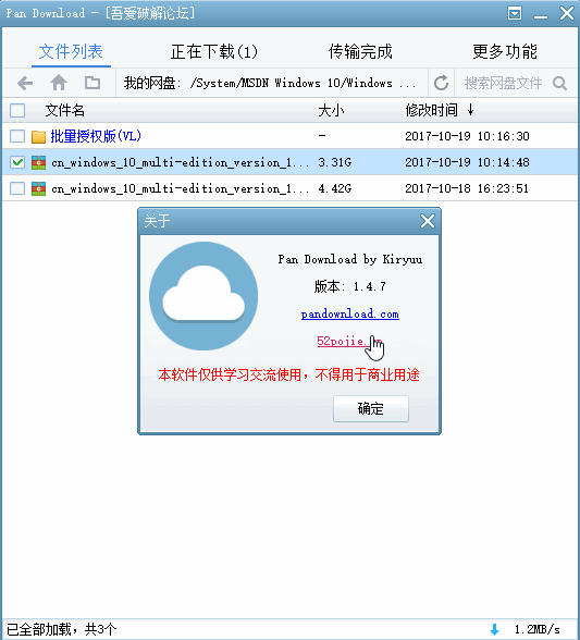 PanDownload,百度网盘高速下载器。这款小巧免费的工具由52pojie原创会员Kiryuu制作,采用了Aria 2技术,支持离线下载、新番下载、提取下载链接、自定义Aria2配置、自定义分享密码,原理类似油猴脚本+IDM,软件获取直链后调用Aria2进行下载,登陆网盘账号获取自己的网盘资源下载。这款超级快的百度网盘下载工具能真正不限速高速下载,大家公认的目前最强大、最好用、最有效的第三方百度网盘下载客户端。