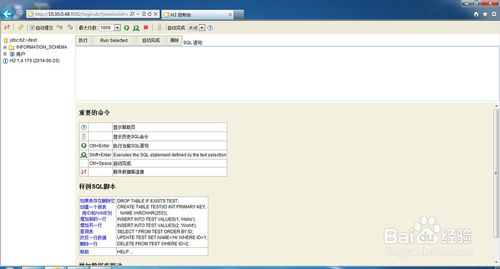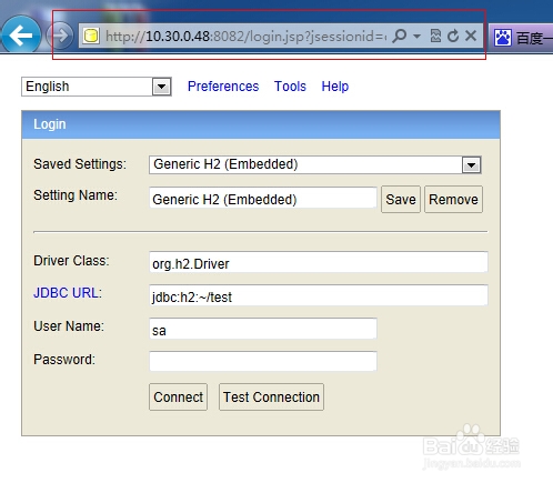 3、 jdbc数据库URL:jdbc:h2:~/test (test为h2 database默认提供的测试数据库)