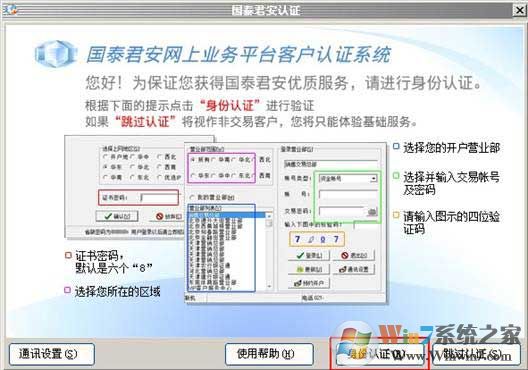 2)、弹出国泰君安富易集中交易版的“验证证书”界面,选择上网地区(默认为“开户地”,如您目前不在开户地,请就近选择上网地区),输入证书密码(默认为888888,您可登录富易后进行修改),点击“确认”。