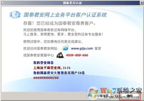 4)、等待系统进行用户名和密码分配片刻,弹出我们的欢迎界面如下,点击“确定”进入国泰君安大智慧登录界面