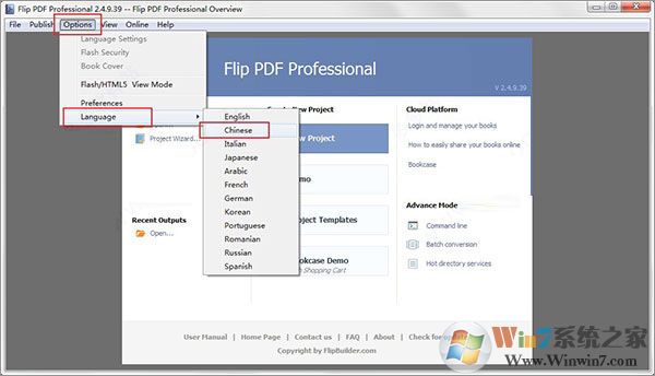 8、这时,打开软件发现默认是英文,点击Options-Language-Chinese;
