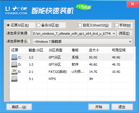 4.打开u大师u盘启动盘制作工具pe里面的disk genius分区助手,点击快速分区,选择GUID,然后选择分区数目,如果读者的是guid分区那么这步可以省略: