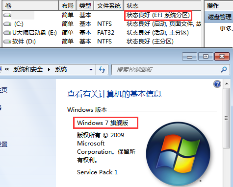 6.最后系统就安装完成了,可以发现这里多了一个efi的系统分区,说明uefi+gpt安装win7成功: