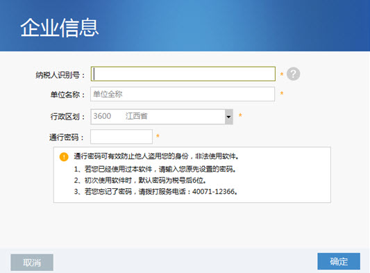 企业信息:包括纳税人识别号、单位名称、行政区划和通行密码部分,设置后点击【确定】。