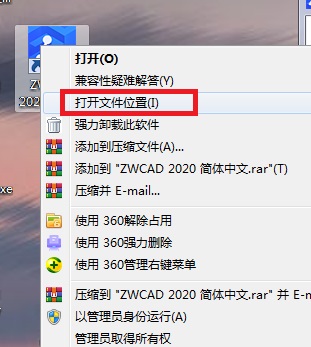 5、找到桌面的快捷方式点击右键“打开文件位置”,或者也可以直接去“C:\Program Files\ZWSOFT\ZWCAD 2020”。