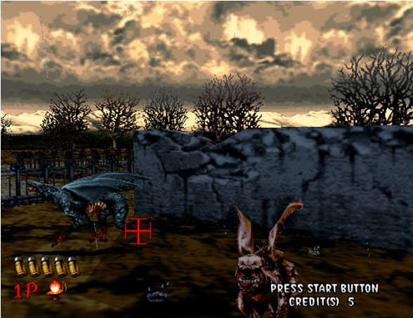 开场都是几个小丧尸,你只要不停扣动扳机即可。注意,1P使用的手武器能自动上弹,基本可以当作机武器使用。在解决了几个带翅膀的天使狗狗之后,你就可以看到Sophie了。