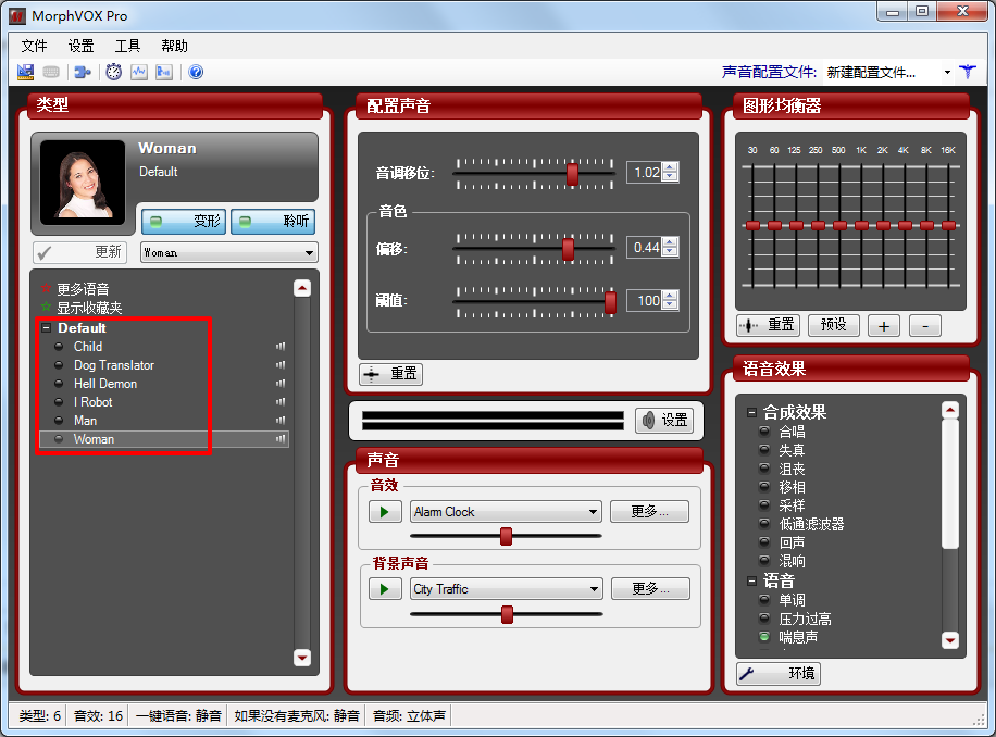 1、安装完成后,打开MorphVOX Pro破解版,左侧列表可选择需要变声的声音,小孩/狗/机器人/男声/女声等,也可以用头像区分
