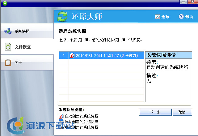 还原大师是一款系统还原工具,可以一键恢复系统,快速恢复误删除文件。可以帮助用户恢复之前所保存的还原点中恢复已经删除的单个文件,把你的系统恢复到你想要的每一个健康的状态,使您的计算机保持工作在最优的环境下,保证您计算机上各种数据的完整和安全,还可以有效防止数据丢失,是你保护计算机安全的不错的选择!