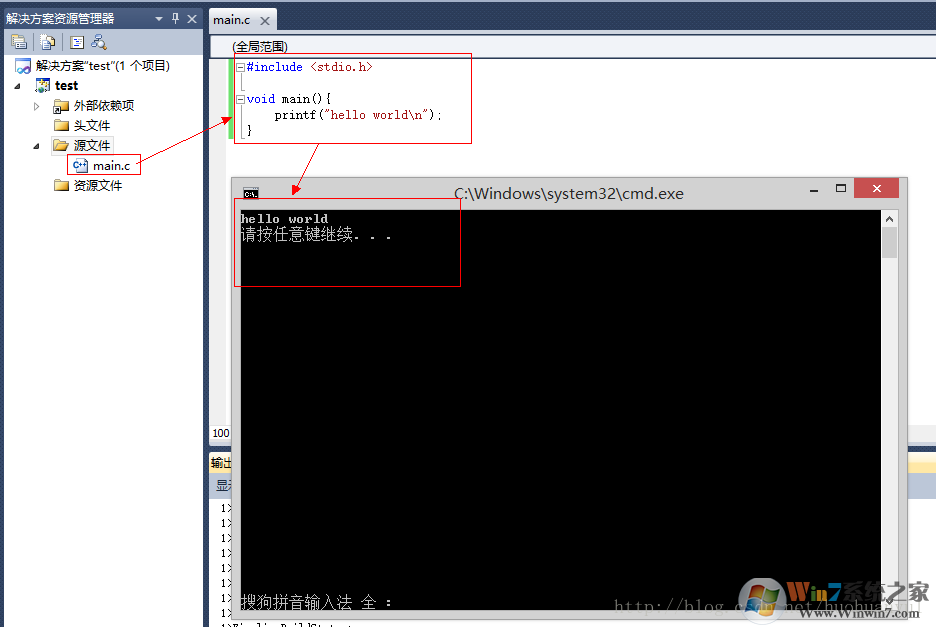 此时,在左侧源文件下就可以看到新建的文件了,如本人创建的main.c文件,然后输入程序,按【Ctrl+F5】运行即可,示例如下: