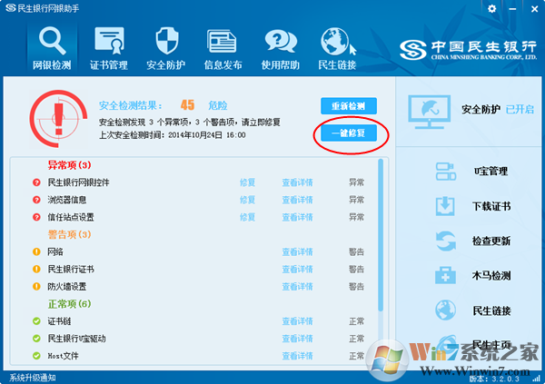 若检测结果中有问题需要修复的话,请点击“一键修复”,修复完成后再使用网银。