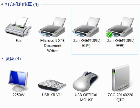 即可查看到成功添加的图像虚拟打印机:Zan彩色图像打印机、Zan黑白图像打印机;