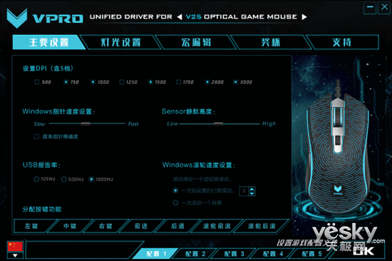 主要设置页面中,可选五挡DPI,最高DPI为3000,同时还有指针速度、静默高度、USB报告率、滚轮速度均可以自行调整。
