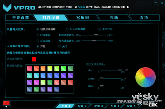 灯光设置页面中,用户可以控制距离感应功能的开关,背光效果和颜色、呼吸灯的呼吸速度以及灯光亮度调节。