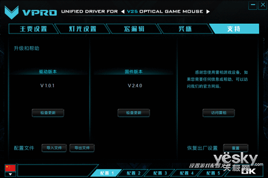 支持页面中,驱动版本及固件版本的检查更新,并设有恢复出厂设置的重置按钮。