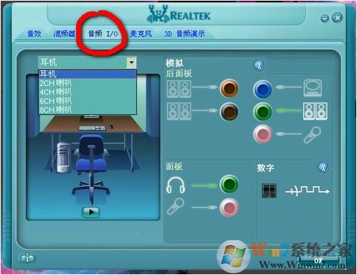 4、在“音频I/O”标签页中。先选择声音输出设备,之后会弹出设备接头设置窗口,如果将设备插入电脑后没有声音的话,可以从此处查看。
