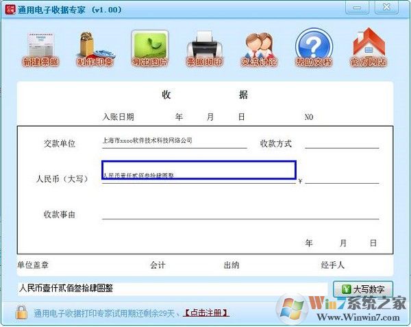 2、通过鼠标在收据上点击后在编辑框内输入收据的内容